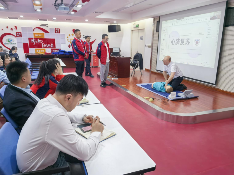 講座中,趙醫(yī)生首先聚焦心肺復(fù)蘇(CPR)急救知識(shí)和自動(dòng)體外除顫儀(AED)的使用技巧進(jìn)行詳細(xì)講解。通過生動(dòng)的案例分析和現(xiàn)場實(shí)操互動(dòng),讓理論知識(shí)轉(zhuǎn)化為可操作的技能。在心肺復(fù)蘇演示環(huán)節(jié),趙醫(yī)生邀請(qǐng)現(xiàn)場員工借助模擬人教具,親身實(shí)踐胸外按壓和人工呼吸操作。“按壓深度要達(dá)到5—6厘米,頻率保持在每分鐘100—120次。”趙醫(yī)生一邊示范標(biāo)準(zhǔn)動(dòng)作,一邊糾正員工按壓時(shí)的手勢和力度。在AED使用教學(xué)中,趙醫(yī)生結(jié)合模擬設(shè)備,對(duì)設(shè)備操作流程進(jìn)行全流程拆解,從開啟電源、粘貼電極片到依照語音提示實(shí)施除顫,每個(gè)步驟都進(jìn)行了細(xì)致入微的演示。這種沉浸式實(shí)操互動(dòng)模式,讓員工們直觀掌握了急救要點(diǎn),現(xiàn)場學(xué)習(xí)氛圍熱烈濃厚。實(shí)用的急救知識(shí)使員工們具備了應(yīng)對(duì)突發(fā)狀況的能力,為守護(hù)生命安全構(gòu)筑了堅(jiān)實(shí)屏障。