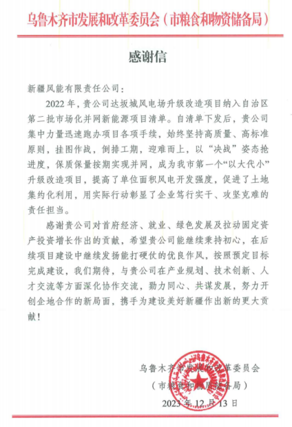 (通訊員 朱鑫鑫/攝影 龔俊屹)12月13日,風(fēng)能公司收到烏魯木齊市發(fā)展和改革委員會(市糧食和物資儲備局)發(fā)來的感謝信,信中對風(fēng)能公司達(dá)坂城升級改造項(xiàng)目在自治區(qū)第二批市場化并網(wǎng)新能源項(xiàng)目中保質(zhì)保量保時(shí)完成并網(wǎng),為首府經(jīng)濟(jì)、就業(yè)、綠色發(fā)展及拉動(dòng)固定資產(chǎn)投資增長作出的貢獻(xiàn)表示高度肯定和感謝。